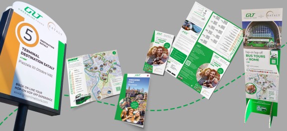 L’attività è stata molto ampia e ha riguardato molti materiali diversi, dall’abbigliaggio degli autobus dell’Hop on Hop off alla grafica delle fermate presenti in tutta la città, dalla brochure aziendale ai totem pubblicitari, dai cartelloni ai materiali promozionali come cartelline stampa e materiali informativi minori.